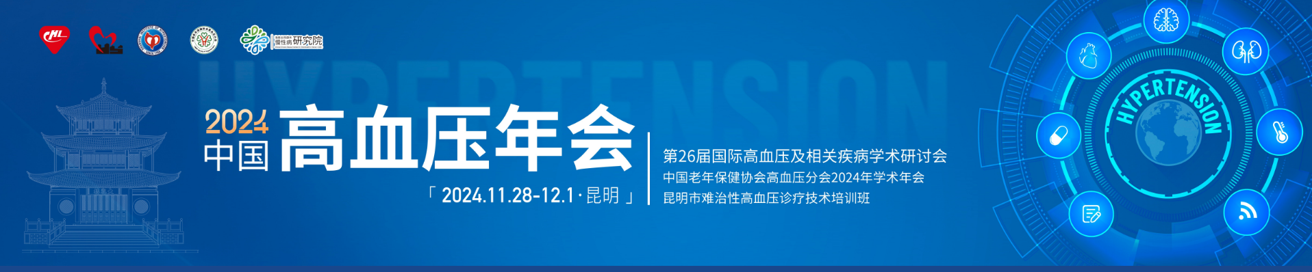 由中国高血压联盟、中国老年保健协会高血压分会、上海市高血压研究所、北京高血压防治协会、海南谷雨康禾慢性病研究院、昆明市医学会高血压专科分会、云南省阜外心血管病医院联合主办,国家心血管病中心云南省高血压专病医联体、云南省医师协会高血压专业委员会、云南省医师协会心血管分会、云南女医师协会高血压专业委员会、云南省中西医结合学会心血管病预防与康复专业委员会、昆明市延安医院协办的2024中国高血压年会、第26届国际高血压及相关疾病学术研讨会、中国老年保健协会高血压分会2024年学术年会、昆明市难治性高血压诊疗技术培训班将于2024年11月28日-12月1日在昆明召开。